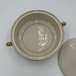 Keywords: serving dish, covered casserole, gold band, floral motif, porcelain serving, kitchenware, tableware, vintage style, elegant serving, dinner party, special occasion, decorative dish