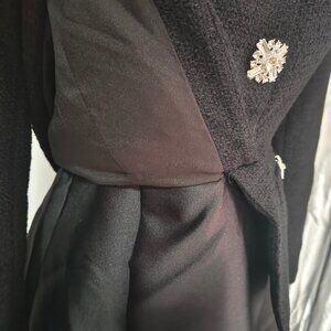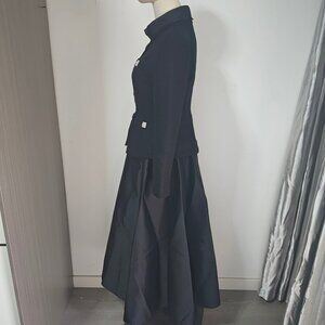 Perfectly poised for all occasions, this tailored midi dress unites the satisfying texture of bouclé with the elegant sheen of a full taffeta skirt. Sparkling buttons are the cherries on top.