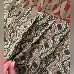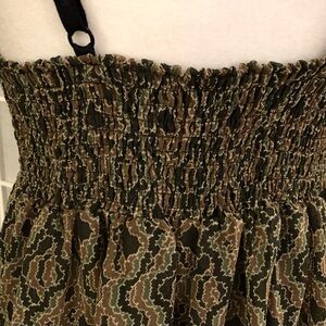 COP.COPINE PARIS “Japet” dress. This very unique dress is in excellent condition. The top part has a ruffled cover over the elastic straps. The front is supposed to have the sides partially open. Keep in mind this does not fit the mannequin. Ruched in back. Lined. The colors are hard to explain. Red, taupe,brown, black. So hard to describe this dress. It is stunning and I saw no flaws. . See measurements. EUC