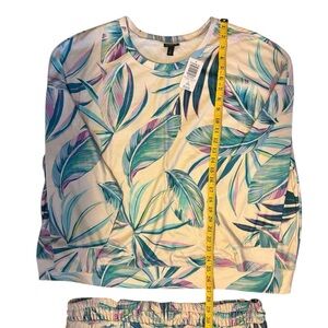 Relax in style with this tropical leaf print lounge set. Features vibrant green and blue leaves on a cream background. Perfect for casual wear.