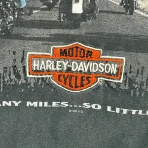 Vintage 1998 HARLEY DAVIDSON tee featuring "So Many Miles" embroidery and dealership graphics from New Jersey. A true classic with rich biker heritage and timeless road-worn style.