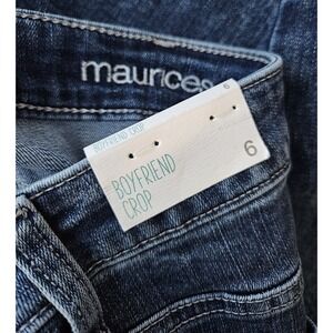 These Maurices Boyfriend Crop Jeans in size 6 offer a relaxed, comfortable fit with a stylish cropped length. Made from a soft and stretchy cotton-poly-spandex blend, they feature a medium blue wash with light fading, classic five-pocket design, and trendy raw frayed hems. Perfect for casual everyday wear.