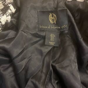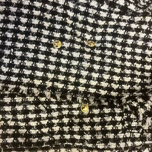 Chic tweed blazer. Classic black and white pattern. Perfect for stylish layering.