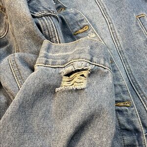 Stylish distressed blue denim jacket perfect for casual outings. Features a classic design with button closures and chest pockets. Graphics on back.