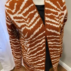 Stylish zebra print cardigan from Nine West. Cozy knit fabric. Duster style. Deep pockets for carrying extras. Perfect for layering. Size Small.