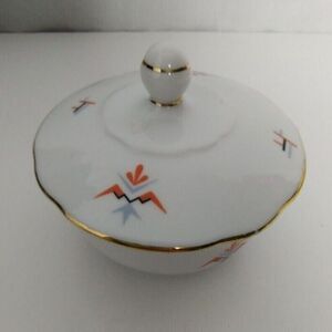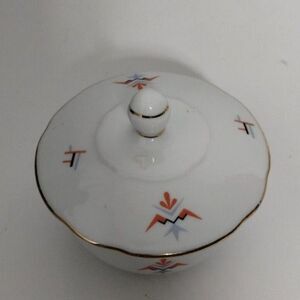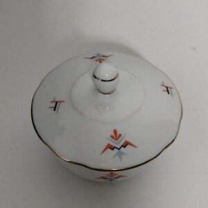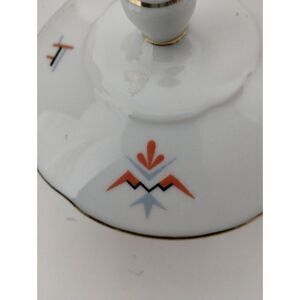 Keywords: vintage sugar bowl, porcelain sugar bowl, sugar bowl with lid, retro sugar bowl, geometric design, gold trim, tableware, kitchen decor, vintage kitchen, mid-century modern, serving bowl, decorative bowl