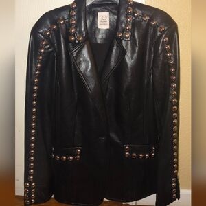 Elevate your style with this chic black studded jacket. Perfect for adding an edgy touch to any outfit.
