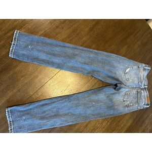 Keywords: distressed denim, ripped jeans, paint splatter, mid rise, casual, boyfriend style, everyday wear, trendy, comfortable, street style, denim, jeans, medium wash
