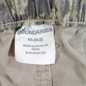 Boundaries women’s camouflage cargo pants in size XS (fits approx. women’s 0–2). These utility-style pants feature an elastic waistband for comfort and easy fit, along with multiple cargo pockets for function and storage. Made from a cotton-spandex blend, offering slight stretch while remaining durable.