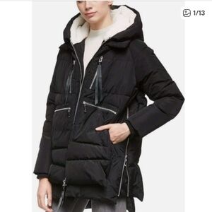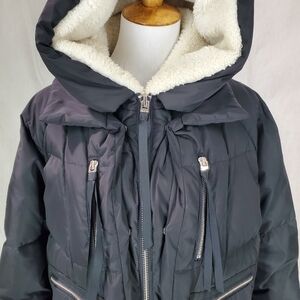 Color: black with orange lining and white sherpa hood lining, silver hardware