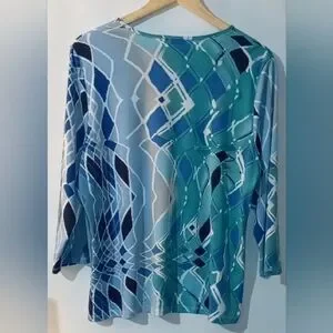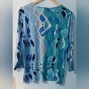Allison Daley Large Blue Teal Abstract Geometric Blouse 3/4 Sleeve Knit Top L