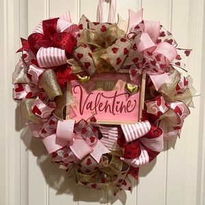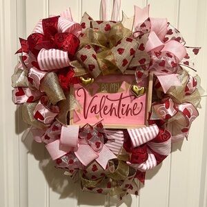 Burgundy mesh backing. Valentines themed wired ribbons (8 varying styles). Red, Pink & White W/ Hearts Design. Has a wooden “Be My Valentine” sign attached.