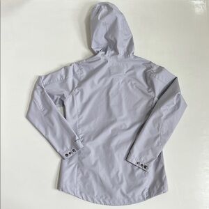 Light lavender rain jacket with hood and front zipper. Ideal for those rainy days. Size small. Good used condition, one small spot on sleeve shown in last picture.