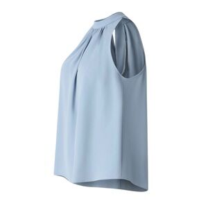 Chic Halara sleeveless blouse in a pretty powder/sky blue. Features a high neckline with soft pleating/gathering, a halter-style cut, and a flowy relaxed fit that’s perfect for work, brunch, or layering under a blazer.