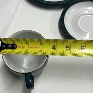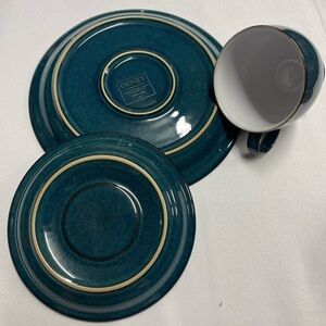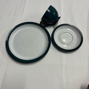 Denby, Greenwich Dish set Footed Cup, Saucer, & Lunch Plate Green & white 3 pc
