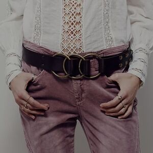 Beautiful vintage leather waist belt designed for women, featuring a studded brown color and a unique 3 ring buckle. Made in the United States during the 2000s, this original accessory exudes a stylish and edgy vibe. The snap over design adds a trendy touch to any outfit, making it a versatile and fashionable addition to any wardrobe. The branding g is not there or has worn off. This is either a Nyovee or Free People. In very good condition. Few small scratches. Very nice quality belt.