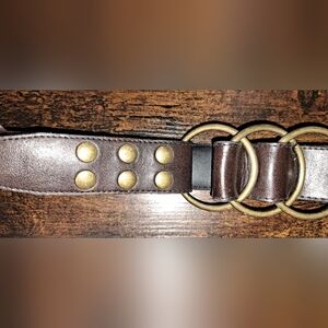 Ladies Vtg Leather Waist Belt 3 Ring Buckle Studded Brown Snap Over S-M