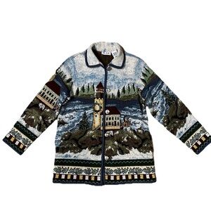 VTG 90s Blair Holiday Lighthouse Snowman Tapestry Jacket Nautical Anchor Medium