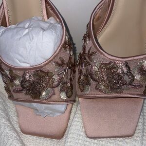 Chic pink mules with gold floral accents. Perfect for a stylish look.