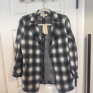 A stylish plaid blazer jacket from Philosophy Republic Clothing. This open-front jacket features a classic black and white plaid pattern and a notched lapel. The textured knit fabric offers a comfortable yet polished look. Perfectly suited for layering over a blouse or tee, this blazer is ideal for casual outings or adding a touch of sophistication to your work ensemble.