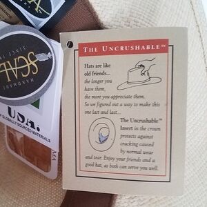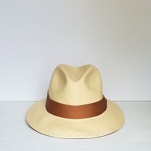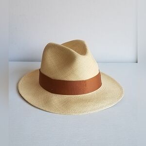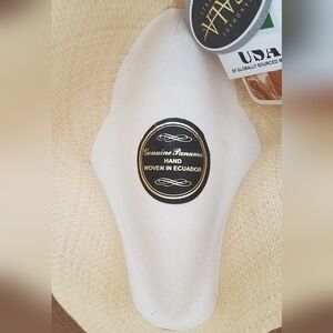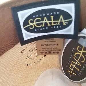 Stay stylish this season in the Scala Men's Hand Woven Panama Safari Hat. Handwoven from paper fibers for a lightweight, breathable feel, and the Teflon coating adds durability. Your look is elevated by the covered crown tip and grosgrain band. Handwoven in Ecuador; Blocked and finished in the USA. Size Large. Approx 22 5/8"-23". Approx 2.5" Snap Brim. Color Natural with Brown Grosgrain Ribbon Hat Band. Features handwoven paper is lightweight and breathable. Grade 8 Panama Straw. Teflon coated for durability. Covered crown tip. Grosgrain band. Scala Metal Side pin. Von Baur Sweatband- moisture wicking. Unlined. New with tags.