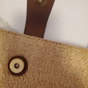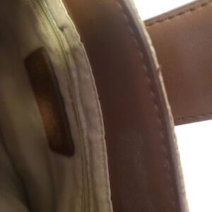 Relic tan woven shoulder or crossbody bag.Three sections ,middle zippered pocket, pouch and zippered pocket.Snap closure and measures 9 high,12 wide and 18 strap.