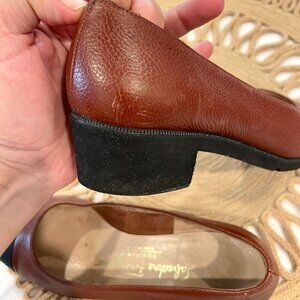 These are gently used Salvatore Ferragamo Vintage Larix Tan Black Pebble Leather Cap Toe Heels Size 5B. In very good condition. Minor signs of wear leather uppers. Discoloration on insoles. See all pics for condition.