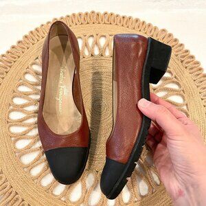 Salvatore Ferragamo brown leather block heel shoes featuring a black cap toe, rubber sole, and classic round-toe silhouette. Crafted in Italy with textured pebbled leather and supportive low heel. Timeless Ferragamo design ideal for workwear, professional outfits, and everyday comfort.