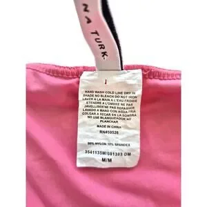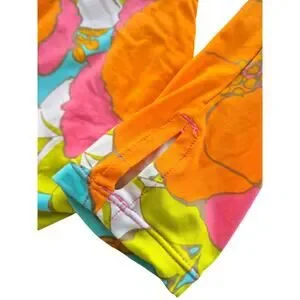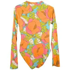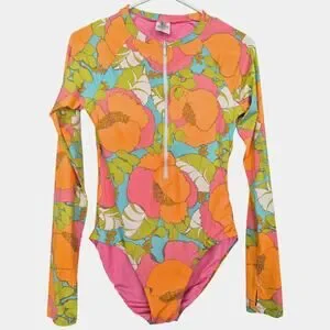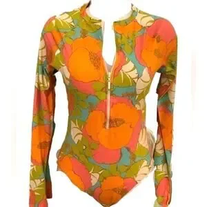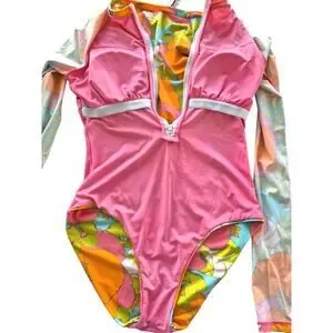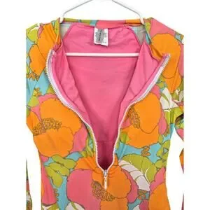 • Style Profile: Trina Turk size medium swimsuit, paddle suit, rashguard, lined, shelf bra with cups, full back coverage, long sleeve with thumb holes. 1/2 zip front closure, colorful, dopamine.