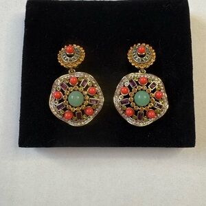 Authentic Heidi Daus drop earrings with multi-stone crystal design. Gold-tone setting with turquoise center cabochon, coral, amethyst, and clear crystals.