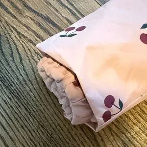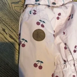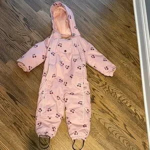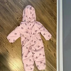 Adorable pink snowsuit with cherry print. Features a hood and full-length zipper.