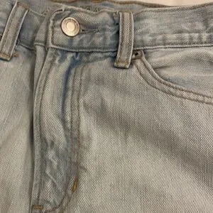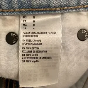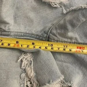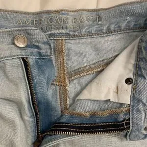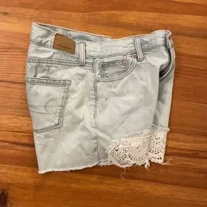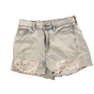Light wash, denim, 100% cotton, cut-off, raw hem, distressed jean shorts with lace embellishments by American Eagle Outfitters in a size zero (0). Front and rear pockets. Front button and zipper closure. Machine washable. Approximate measurements shown in photos. In good pre-owned condition.