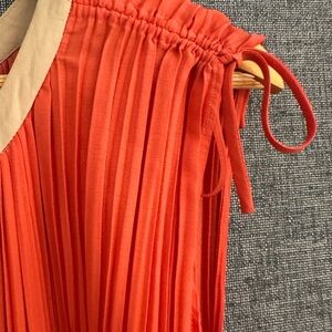Bold pleated design with striking orange and red tones. Perfect for a standout look. Waist tie for the perfect silhouette!