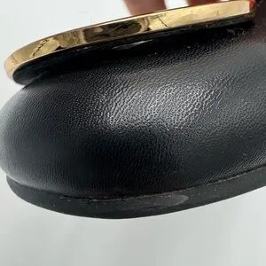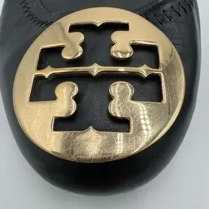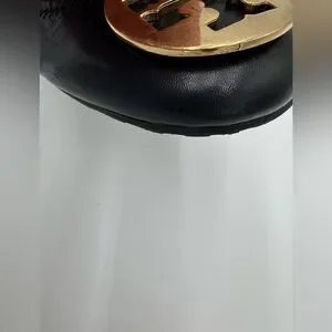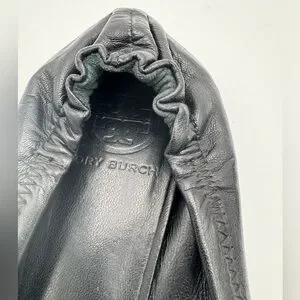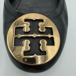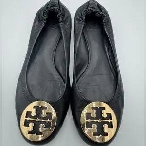 Elegant black leather ballet flats by Tory Burch, featuring a stylish gold emblem. Scratches on emblem(see photos). Size 9.5