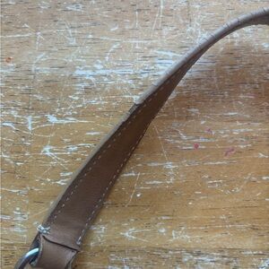 Coach Hamptons shoulder bag 7542 in camel leather. She is darling and structurally in amazing shape! Our girl has seen some adventures:) She has much discoloration on the front, back and bottom, she truly could use a spa day. One bottom corner has some wear. The edges of the strap has wear. The buckle and zipper function perfectly and she is mostly clean inside, some discoloration on the fabric at the very top along the zipper. Please see all pictures. Overall, she is adorable and ready for more adventures!