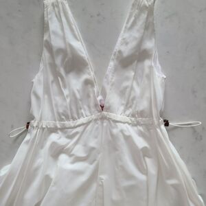 This maxi dress from STAUD has an easy silhouette made from recycled nylon that cinches along the waist with a sporty toggle drawstring. Color is white.