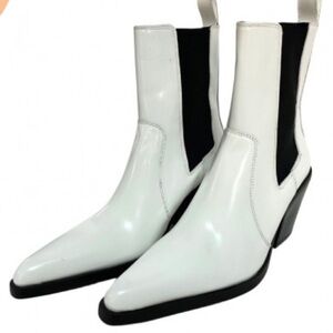 Elegant heeled boots with a sleek design. White leather with black accents. Perfect for stylish outings.