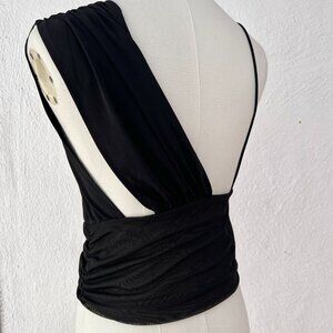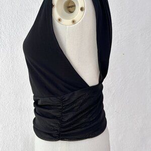 This sexy little top has big Y2K clubwear vibes. Stretchy black mesh with a slight sheen, not see-through and is ruched in all the right places giving it a textured look without bulk.