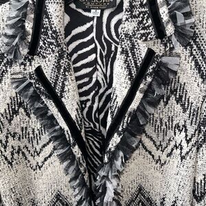 This particular jacket is from St. John’s couture line. It showcases the brand's characteristic use of textured knit fabrics and striking patterns, here a monochrome zigzag combined with a bold zebra print lining. The addition of ruffled trim adds a touch of dramatic flair, typical of St. John's opulent style. Pieces from St. John Knits are highly collectible, appreciated for their quality craftsmanship and timeless yet fashionable designs that often transcend seasonal trends.