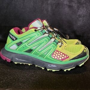 Dynamic Salomon shoes for active women. Lime and magenta design. Ideal for trail running.
