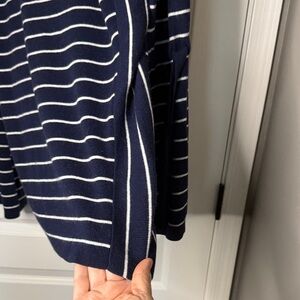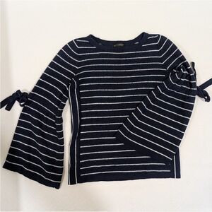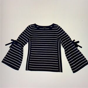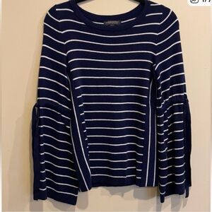 Perfect with white or blue wide leg jeans and sandals for a cruise! Classically elegant navy sweater with white stripes. Features flirty bell sleeves. Gorgeous and new w/ out tags.
