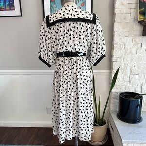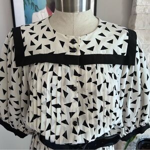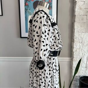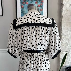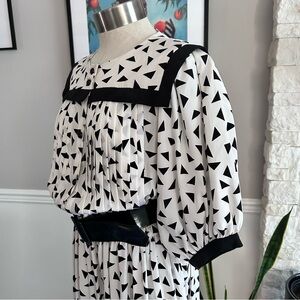 Vintage 80s Nipon Boutique Abstract Print Midi Dress, black & white geometric print, sailor Collar, puff sleeves, button front, pleated bodice, elastic waist. Step into retro charm with this studding 1980s dress, featuring a bold black and white abstract triangle print that gives off New Wave and Memphis Group vibes. SIze tag reads 12 but measures modern day Medium/Large. Check measurements to ensure desired fit.