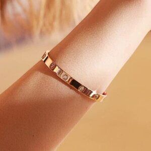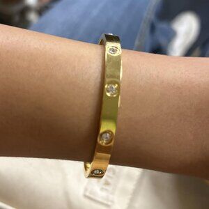 - This 18K Gold-plated bangle bracelets for women creates an alluring design which holds several round stones, they add enough sparkle not to be over powering.