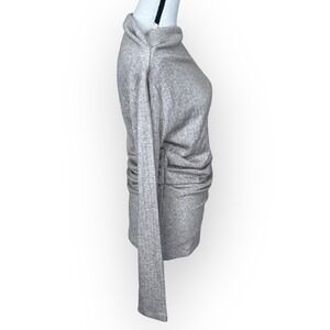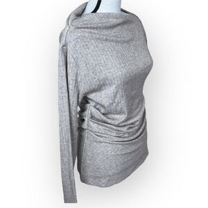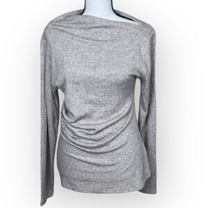 LOFT women's size medium long sleeve top in a neutral tone. This top features a flattering cowl neckline and elegant ruching on the side for a stylish silhouette. The ribbed texture adds subtle detail and dimension.