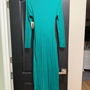 Chic teal dress with long sleeves. Features a stylish waist tie. Ideal for any event.