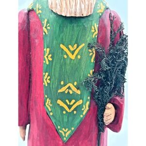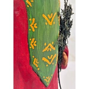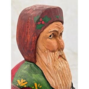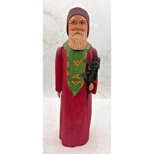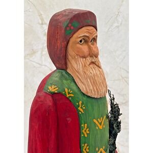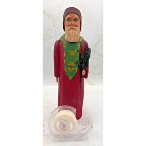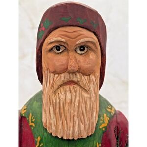 Add a warm touch of handrafted charm to your holiday decor with this 1995 hand -carved Santa by Brenda Yeager Moore. This folk-art style carving features Santa in a deep red robe with a carved beard, detailed stole, and a small evergreen tree in hand. His hood is minimally decorated with hand-painted floral details, giving the piece a unique whimsical feel.