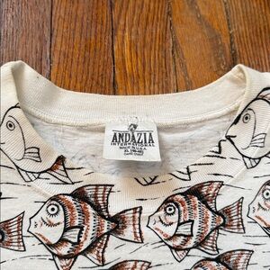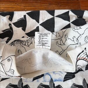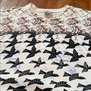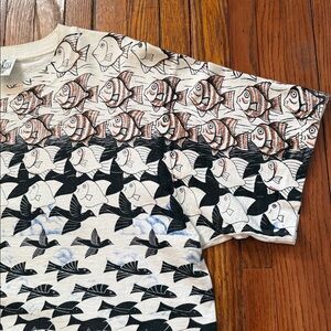 Early 1990’s M.C. Escher AOP Vintage Single Stitch T-Shirt in excellent condition. The graphic is based off of M.C. Escher’s 1948 painting, “Fish & Boat”. As well as his 1938, “Sky and Water”.