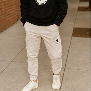 Level up your streetwear game with these Benjamin Black beige / white joggers—techwear vibes with utility details. Lightweight yet structured, made from a durable nylon-spandex blend (perfect stretch), featuring zippered pockets, elastic cuffs, drawstring waist, and cargo side pockets. Size S, pre-owned, great condition—no stains, rips, or visible flaws.