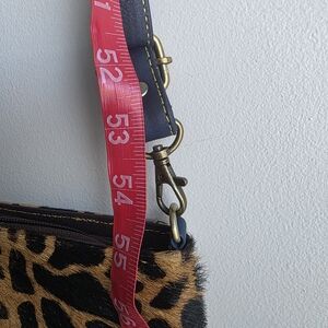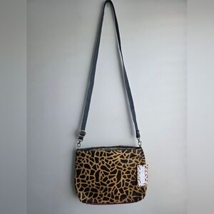 Chic crossbody bag featuring a bold animal print pattern and a striking colorful stripe. Ideal for adding flair to any ensemble. Adjustable leather strap. Beautiful cloth interior with zippered pocket. Animal hair.