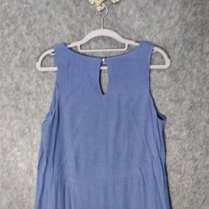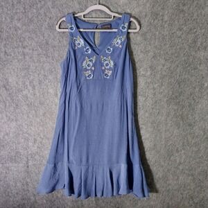 Keywords: dress, blue dress, sleeveless dress, floral dress, embroidered dress, casual dress, summer dress, ruffled hem, keyhole back, size 8, women's dress, ladies dress